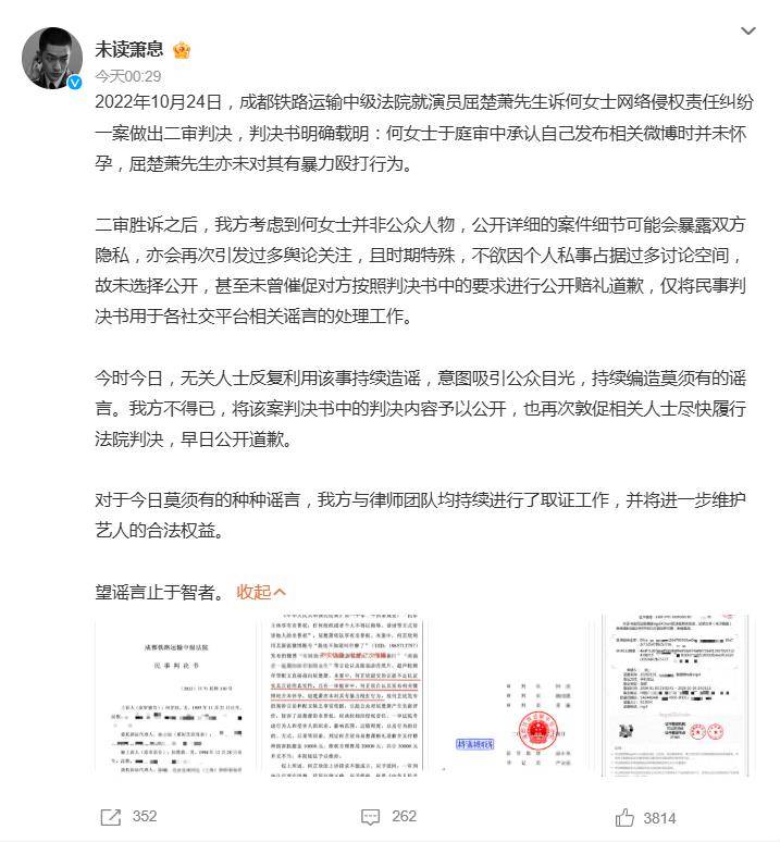 根据成都铁路运输中级法院(2022)川71民终330号判决书载明的事实,何女士在一审庭审中已承认其相关微博言论失实。法院因证据不足认定其构成名誉权侵权,判决何女士公开道歉并赔偿屈楚萧3万元(含精神抚慰金及维权费用)。法律层面的澄清,早在2022年就已落定。