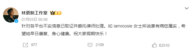 林更新工作室回应“如她所患郁症属实,祝早日康复”,被指暗讽其精神状态。