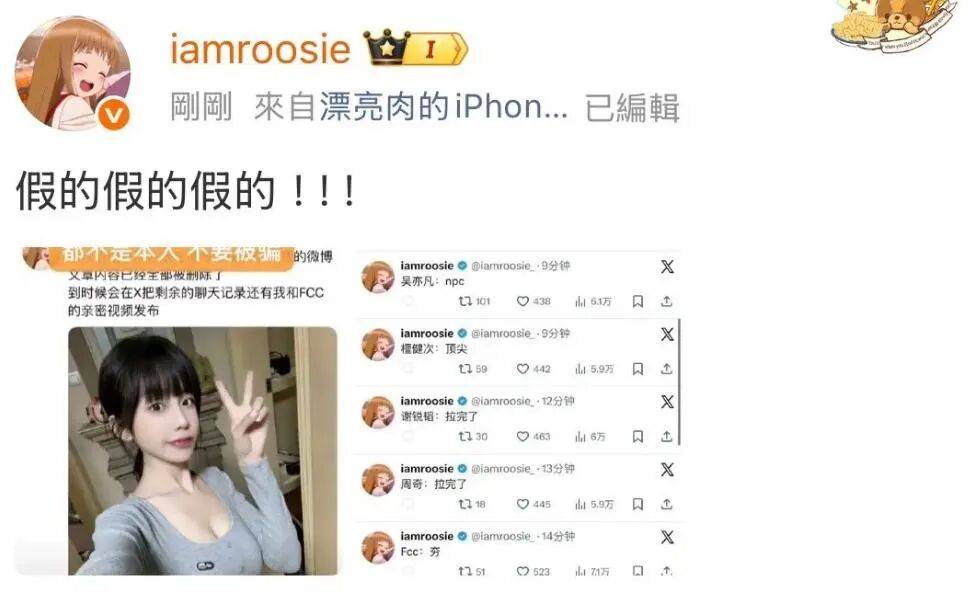 她转战海外平台发布男星“从夯到拉”排名(鹿晗、范丞丞“夯”,檀健次“顶尖”,周奇“拉完了”),但随后打假称该账号系假冒。