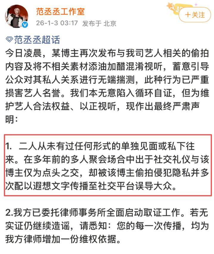 对此,范丞丞予以否认,声称“只是在朋友聚会中见过司晓迪,双方私下没有任何交集,照片是女方偷拍的”。
