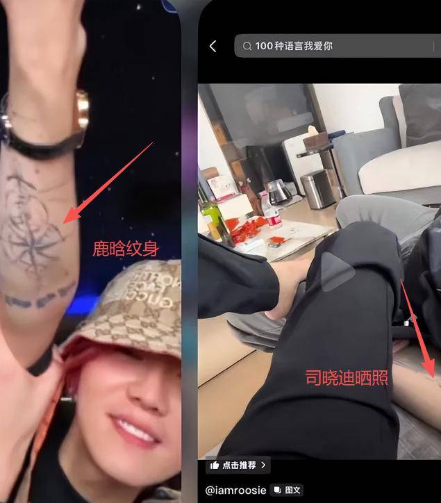 之前司晓迪还晒过一张男顶流手臂纹身的照片,也和鹿晗的纹身一模一样,直接坐实了两人的关系。
