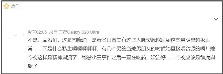 其实司晓迪不是第一次爆料了,她是男星李汶翰、秦霄贤的前女友,知情人爆料她身份的时候,提到了两个细节,一个是司晓迪能给男星资源,一个是司晓迪经历过被小三事件。