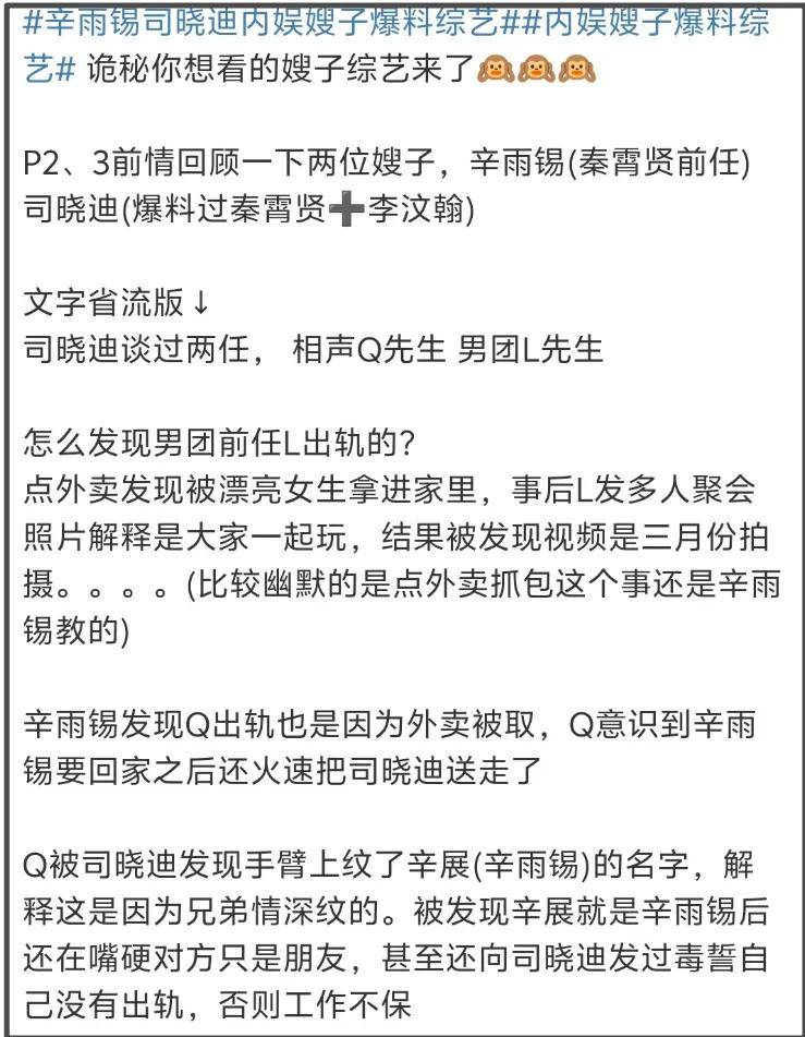 辛雨锡和司晓迪后续还坐下来一起爆料圈子里的男明星,不光详细聊起了司晓迪插足秦霄贤、辛雨锡的过程,提到了司晓迪至少谈过四五个男明星。