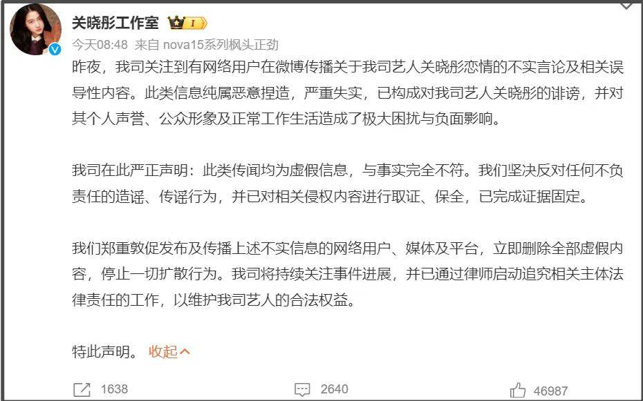 关晓彤同样发了声明,不过应该是为了否认与王安宇的恋情爆料,也就是说,从未官宣分手的鹿晗和关晓彤,又一次各自辟谣,表面上再没有交集了。