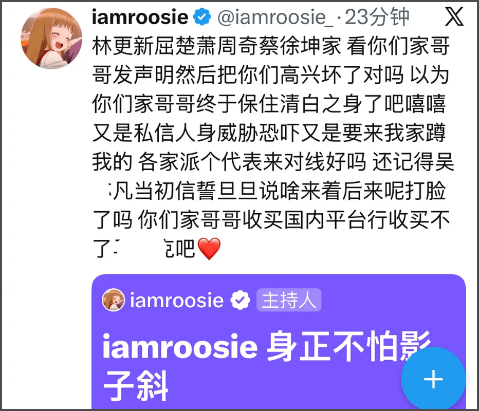 还说已经准备好和各家粉丝对线,“身正不怕影子斜”,似乎手里还有更多证据等着爆料。
