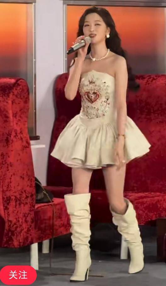 她这条裙子的收腰部分太低,还配了一双厚重的靴子,完全不适合她。