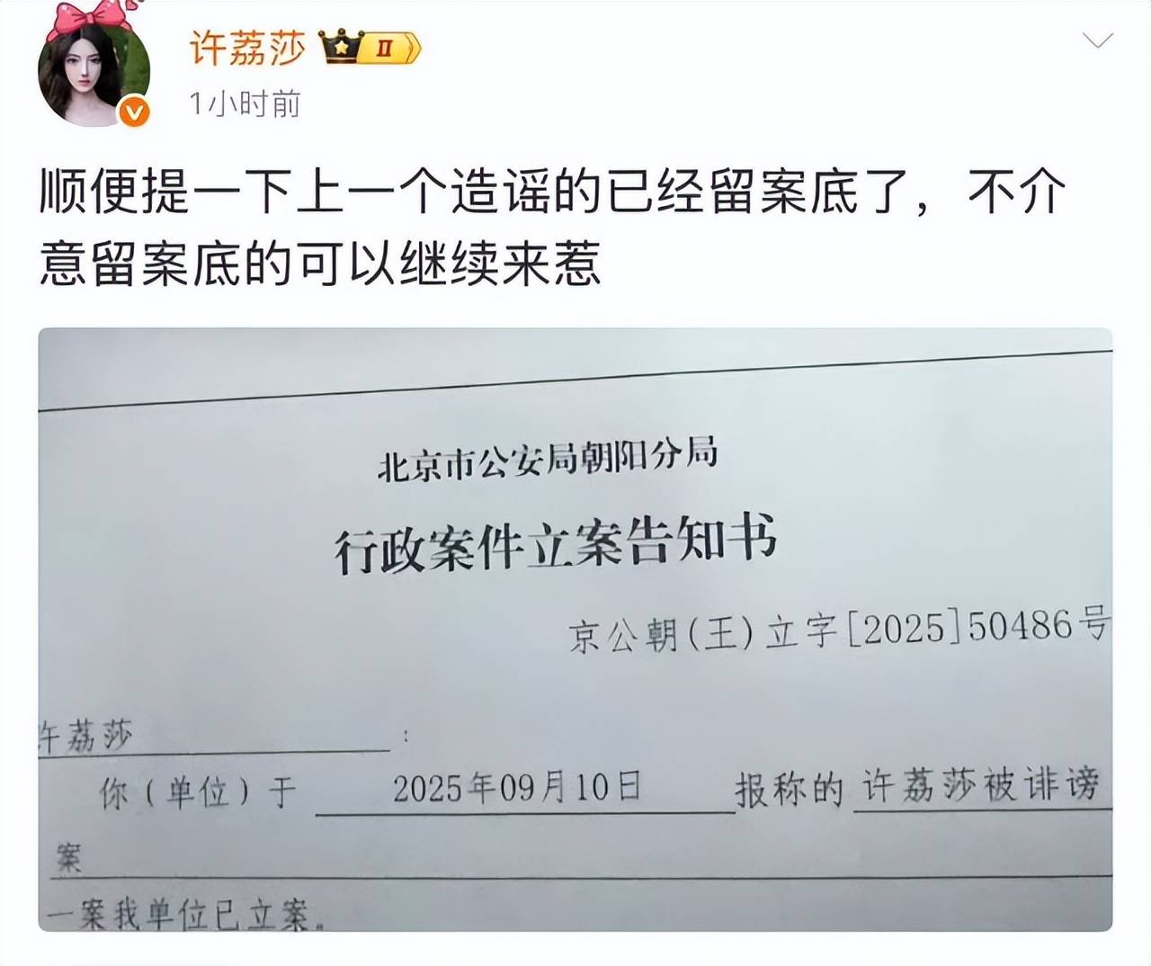 这并非许荔莎首次“亮剑”。她同时强硬警告对方粉丝:“蠢货别惹别洗白,造谣洗白我们就继续,顺便等着收律师函。”为了佐证自己并非空口威胁,她还晒出了一份关键文件——北京市公安局朝阳分局的行政案件立案告知书(案件号:京公朝(王)立字[2025]50486号),并配文“上一个造谣的已留案底”。不过,法律人士指出,这份文书仅证明其报称被诽谤的案件已被警方受理,属于行政立案程序,与经过法院判决形成的刑事“案底”并非同一概念。但这手操作,无疑大幅提升了这场口水战的严肃性和对抗等级。