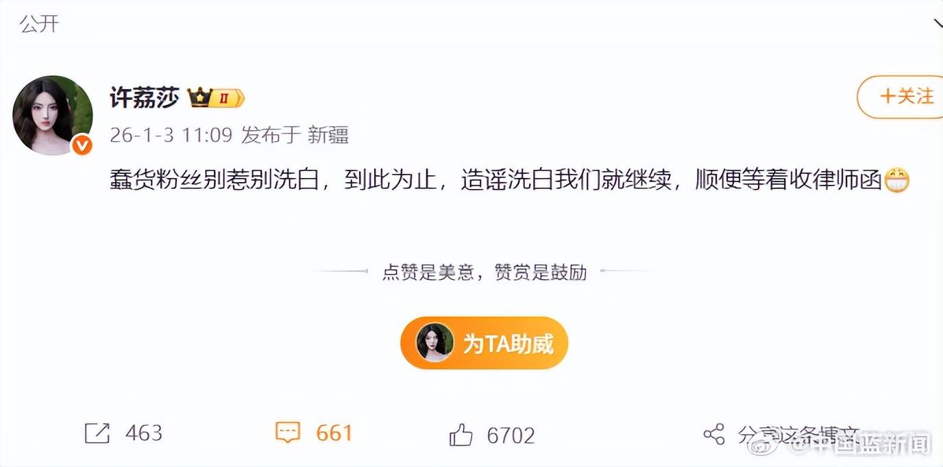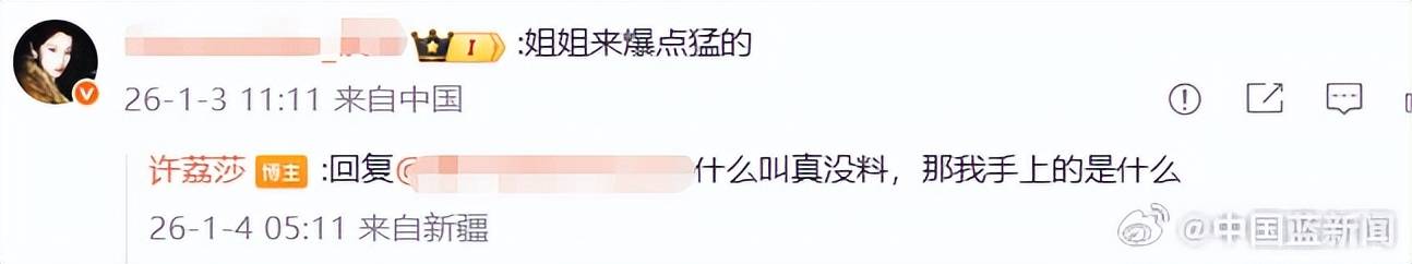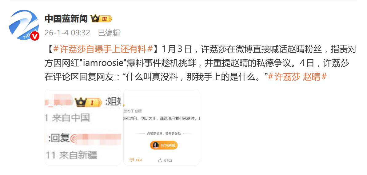 事件起因是网红“iamroisie”的爆料风波,赵晴粉丝疑似借此对许荔莎发起挑衅。2026年1月3日,许荔莎直接在微博下场开撕,点名赵晴粉丝,并重提赵晴的私德争议。当有网友质疑她“没料”时,她更是在评论区抛出那句引人遐想的反问:“什么叫真没料,那我手上的是什么?”——这被普遍解读为,她暗示自己仍握有涉及赵晴的未公开证据。