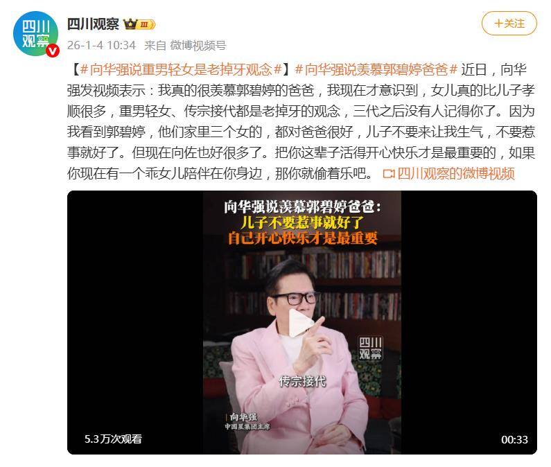 据1月4日报道,近日,影视大亨向华强的一段视频发言,直接让“女儿更孝顺”这个话题冲上了热搜。视频里,他毫不掩饰对亲家郭爸爸的羡慕,直言:“我现在才意识到,女儿真的比儿子孝顺很多”,更抛出一句扎心大实话——“儿子不要来让我生气,不要惹事就好了”。