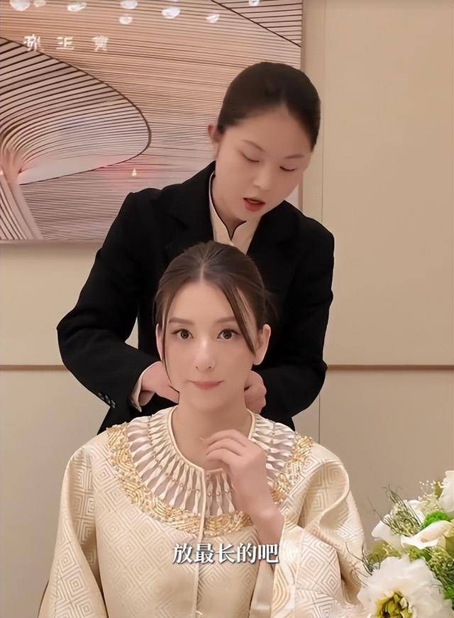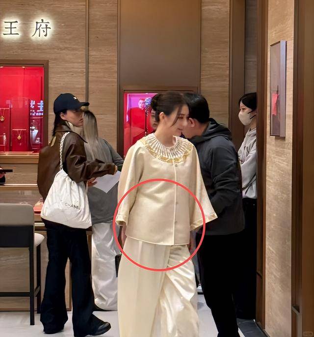 她穿了一身新中式套装,绣着金色花纹,真丝裤子垂坠感十足,头发盘成低髻,拎着爱马仕手提包,看起来贵气逼人。