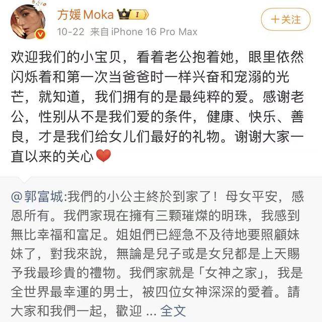 不知不觉方媛生完孩子都已经一个多月了。方媛怀三胎的时候,港媒天天爆料郭富城要当男孩爸爸,送无上限副卡,连月子中心都定了最贵的总统套房。大家都以为这次总算圆了天王的儿