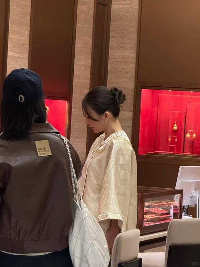 她进店直奔黄金柜台,让店员把看中的款式都摆出来试戴,仔细抚摸金饰的纹理,还认真询问店长设计细节,选得特别较真。