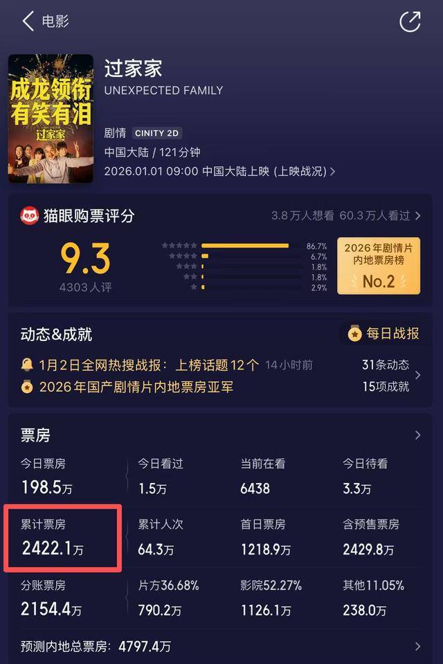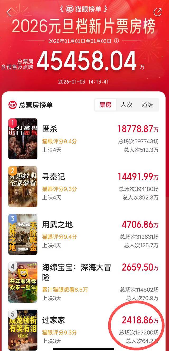 距离元旦档影片上映,已经过去了三天的时间,可《过家家》这部片子的票房却只有2000多万,连第一名《匿杀》的零头都没有。