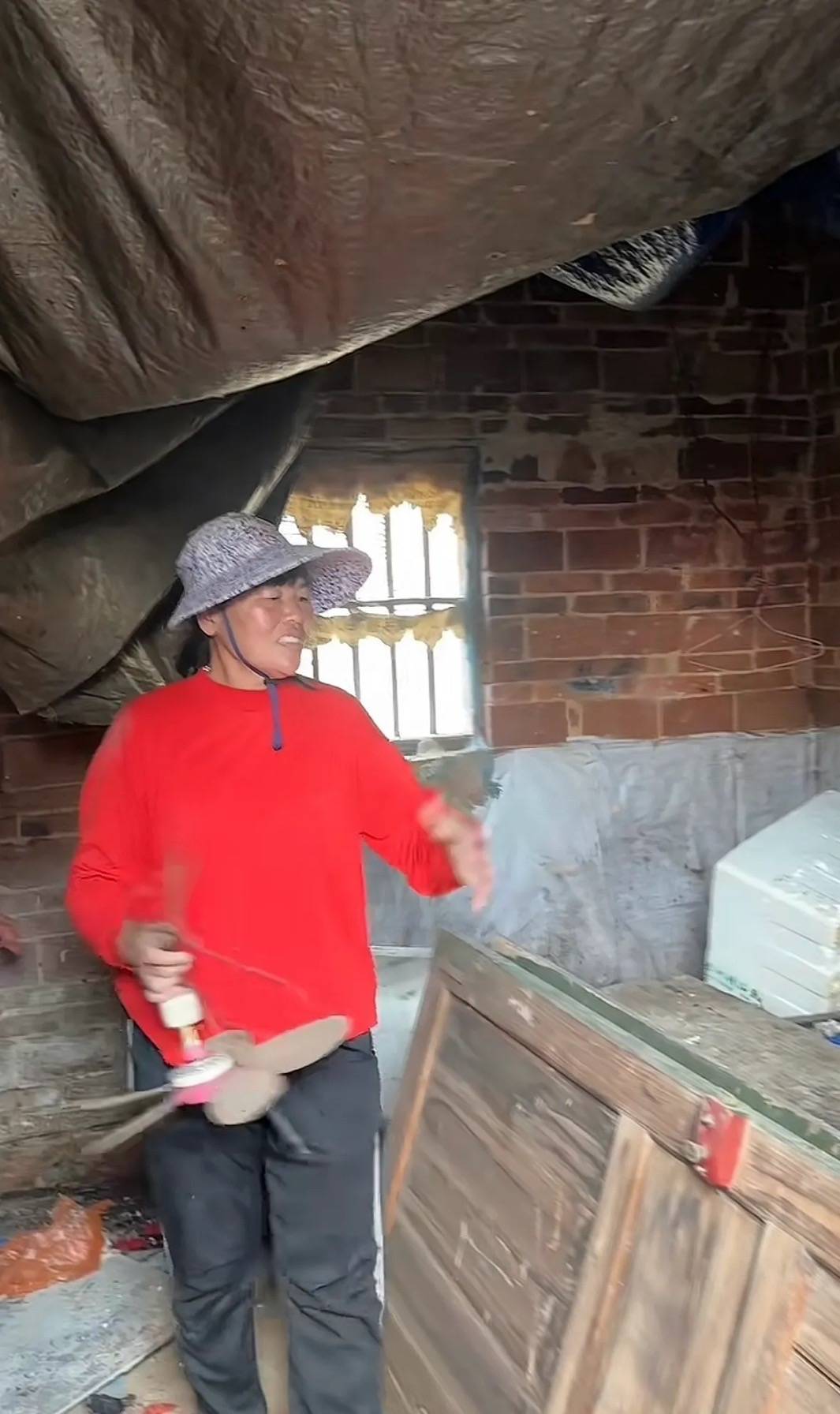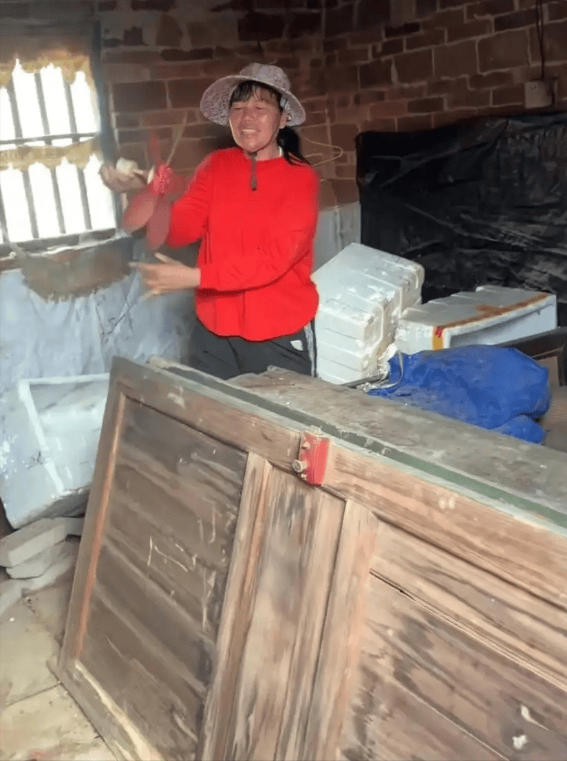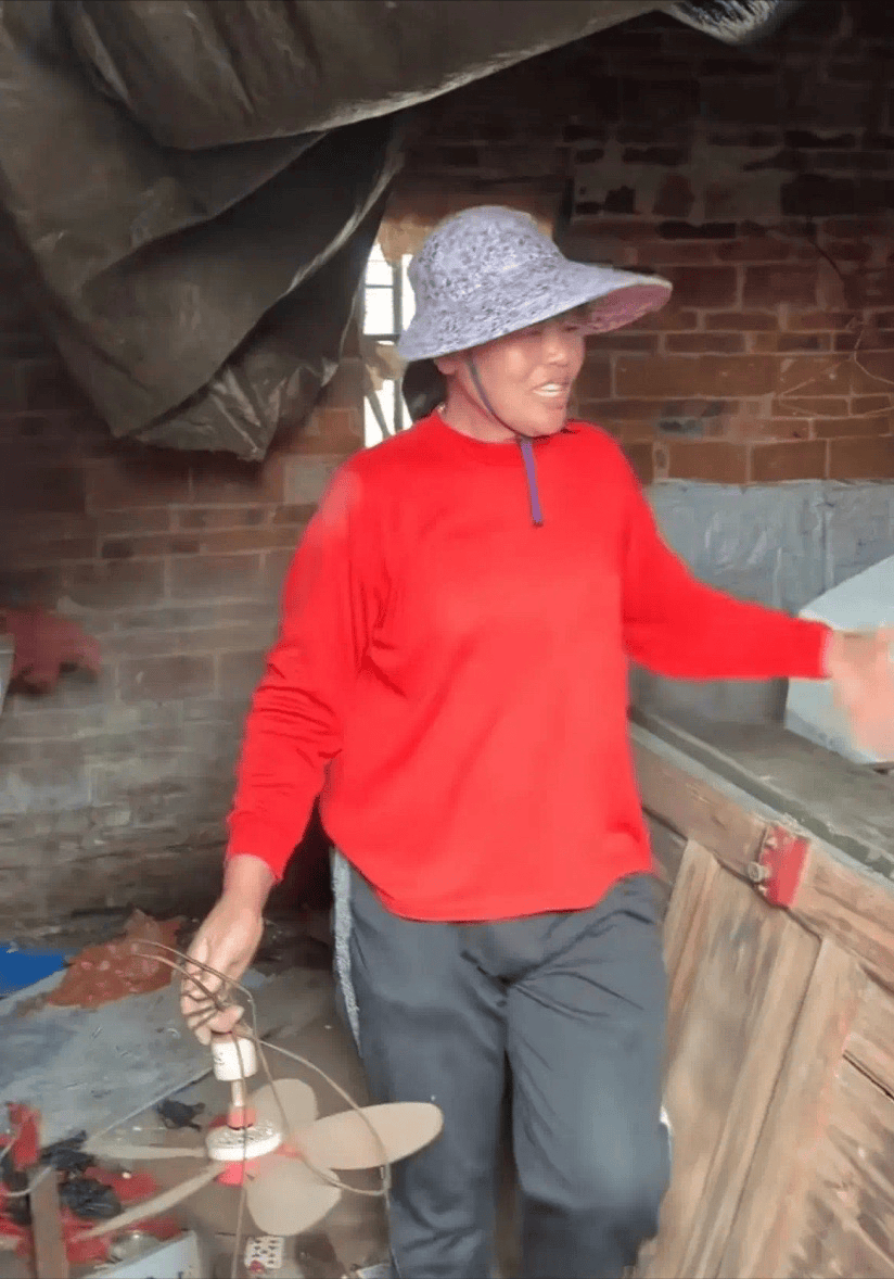 全红婵妈妈穿着红色上衣、黑色裤子,还戴着一顶大檐帽。这套老旧的平房看起来有些年头了,大概率是全红婵爸妈结婚时候的房子。
