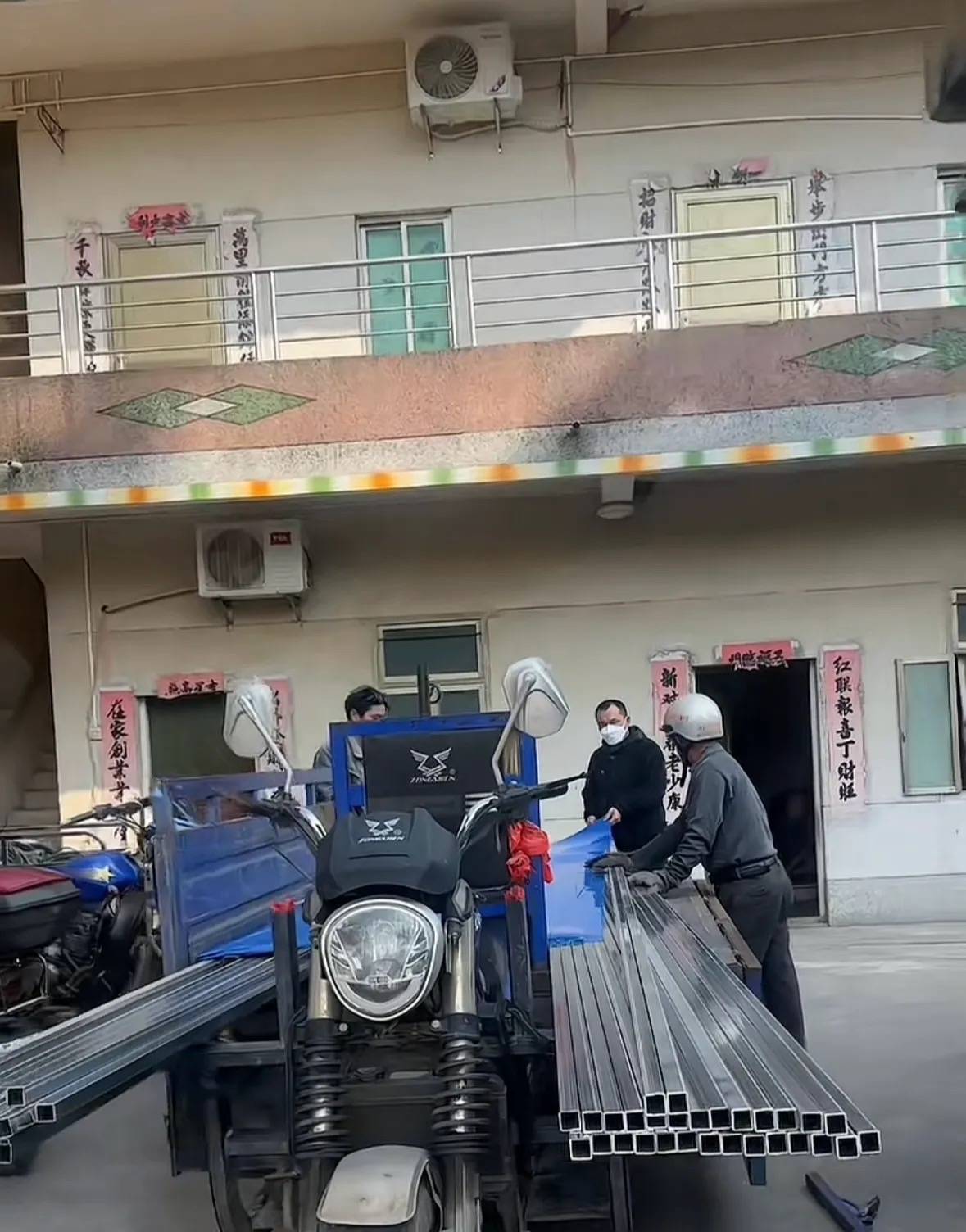 外面围上了蓝色贴片挡板,承包方还是格调别墅,想来新房建得不错、家里人都很满意,老宅重建依然选择了选择格调。
