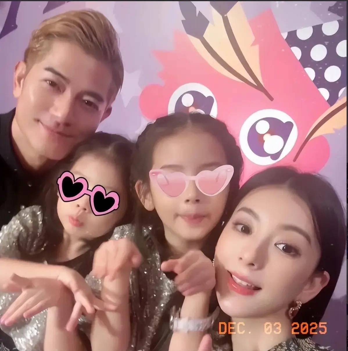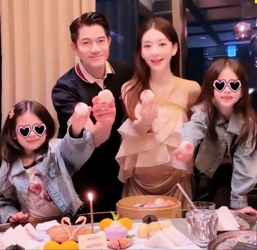 郭富城和方媛一家人的合影,这磨皮效果就不用多说了。