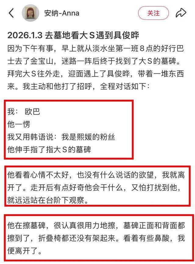 1月3日,有一位精通韩语的网友,前往大S的墓地探望,偶遇了具俊晔。