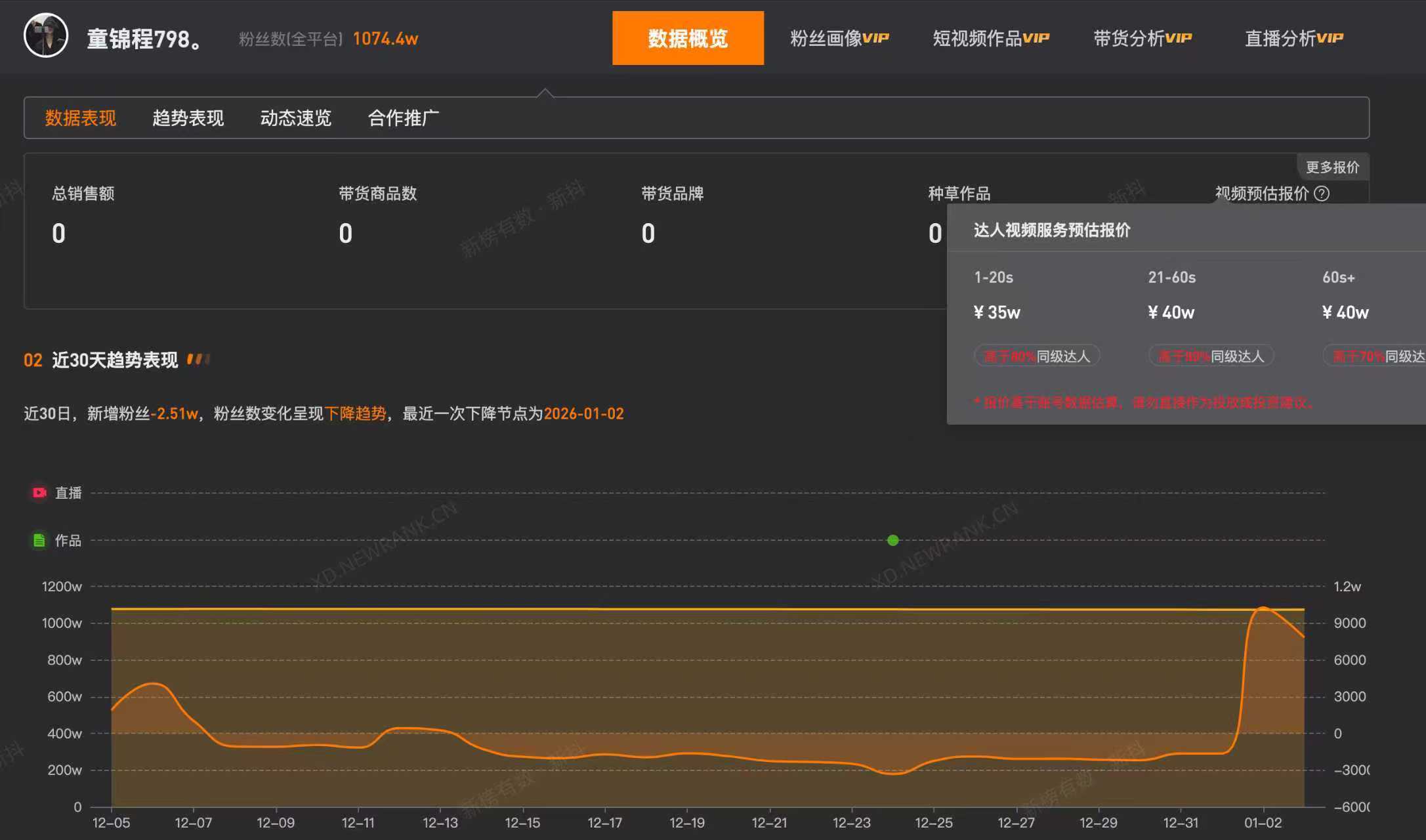 第三方数据显示,“童锦程798。”视频平台近30日掉粉2.51万。商业化水平显示,其1-20s视频广告预估报价为35万,21-60s、60s以上视频广告预估报价为40万。