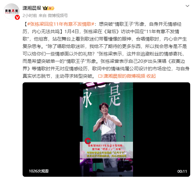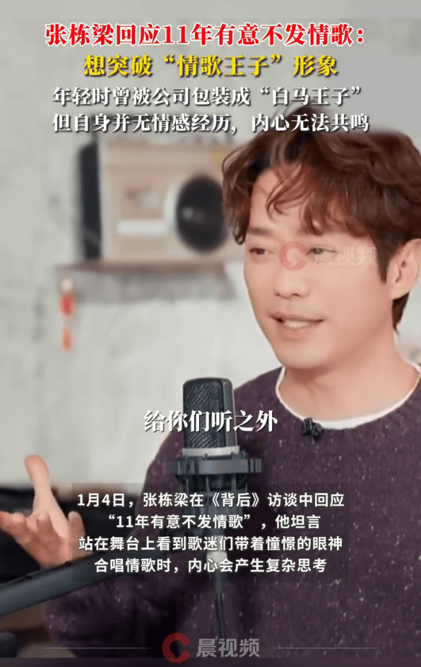 (来源:潇湘晨报)1月4日,张栋梁在《背后》访谈中回应“11年有意不发情歌”,他坦言,站在舞台上看到歌迷们带着憧憬的眼神,合唱情歌时,内心会产生复杂思考。“除了唱歌