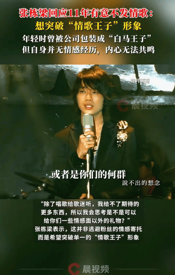 张栋梁表示,这并非逃避粉丝的情感寄托,而是希望突破单一的“情歌王子”形象。张栋梁曾表示自己20岁出头演唱《寂寞边界》等情歌时并无对应情感经历,歌词中的情绪纯属公司设计的市场定位,与自身真实状态脱节,主动寻求转型突破。