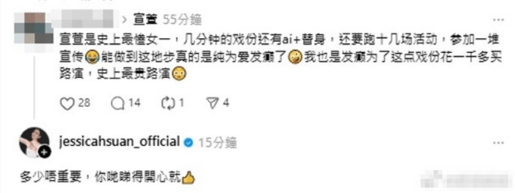 据港媒,宣萱日前在个人社交网站翻牌网友,表示不会出席今日TVB颁奖礼。据悉,宣萱与佘诗曼都有入围视后,而过往TVB有“到才有奖”惯例。还有网友留言“宣萱是史上最惨女一,几分钟的戏份还有ai+替身”,她回应表示:“多少不重要,你看得开心就好。”
