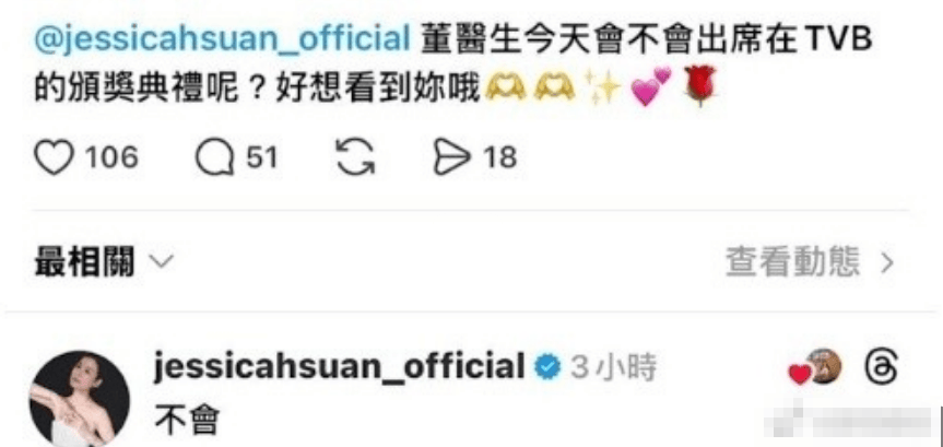 据港媒,宣萱日前在个人社交网站翻牌网友,表示不会出席今日TVB颁奖礼。据悉,宣萱与佘诗曼都有入围视后,而过往TVB有“到才有奖”惯例。还有网友留言“宣萱是史