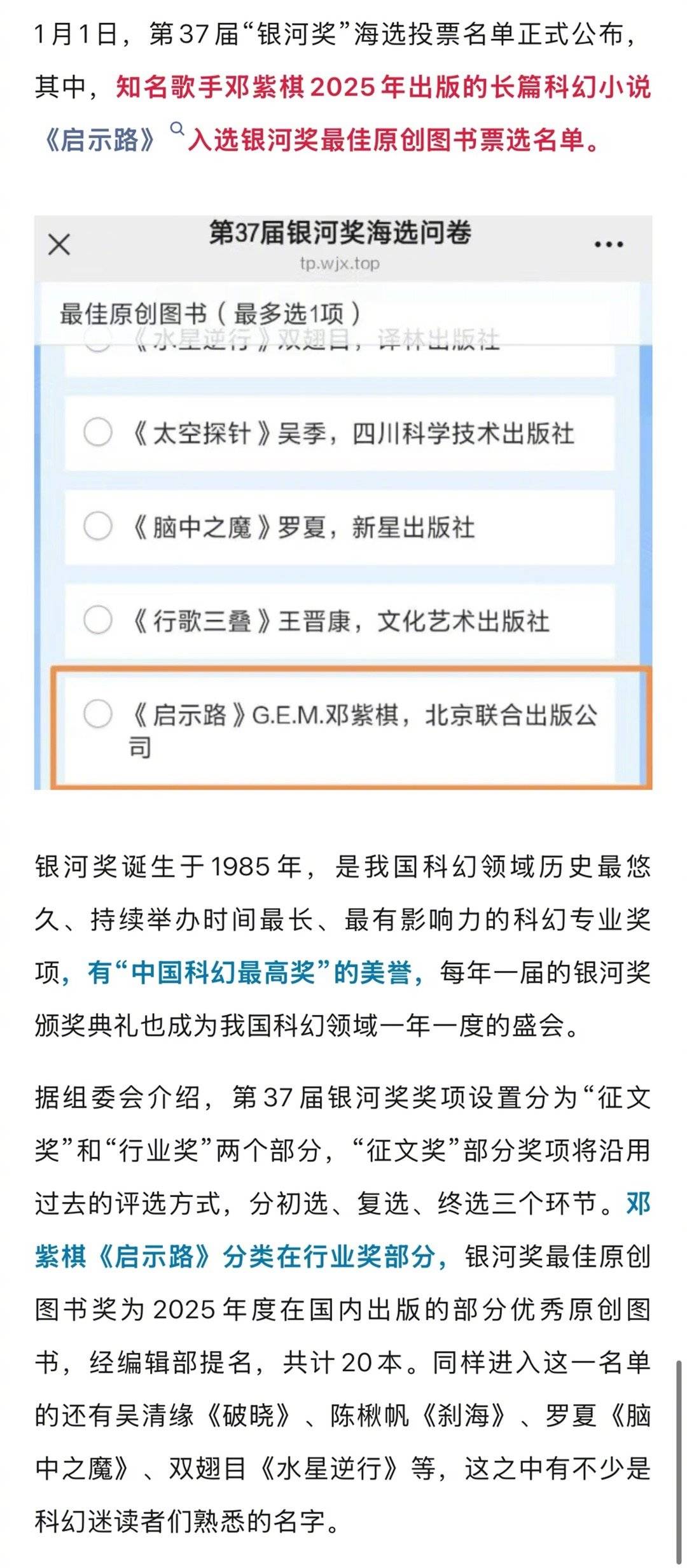 4日,邓紫棋在社交平台上发文回应自己写的科幻小说入选银河奖,她表示:“哇!!!!!我的科幻小说《启示路》入选了银河奖!!!新人作家表示受宠若惊,超级受到鼓励!!!”
