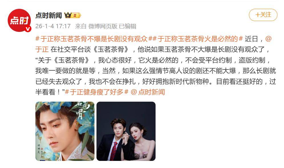 时间拉回到2026年1月4日,于正在社交平台上给《玉茗茶骨》定调,姿态可谓相当“淡定”且自信。他声称该剧不受平台和盗版制约,自己唯一要做的就是“等”。然而,话锋紧接着就来了一记“神转折”:如果这剧不爆,那就是长剧时代的终结。这波“剧不爆=长剧亡”的因果论,被不少网友调侃为“史上最强甩锅逻辑”——成功归功于自己,失败则归咎于时代。