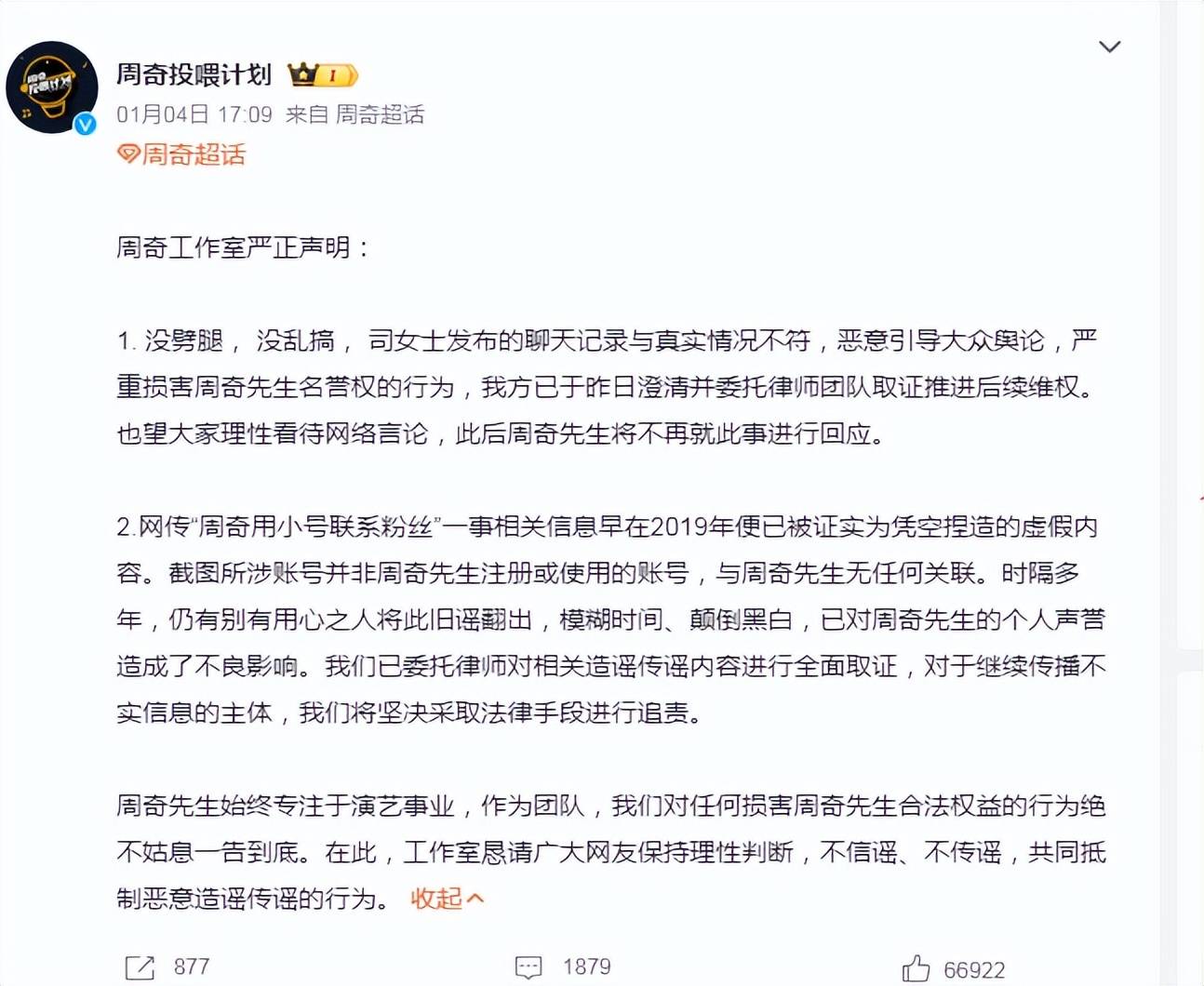 周奇工作室声明强调"没劈腿、没乱搞",称司晓迪发布的聊天记录"与真实情况不符、恶意引导舆论",已启动法律程序。他全程未提及向涵之及恋情传闻,被舆论视为默认关系。