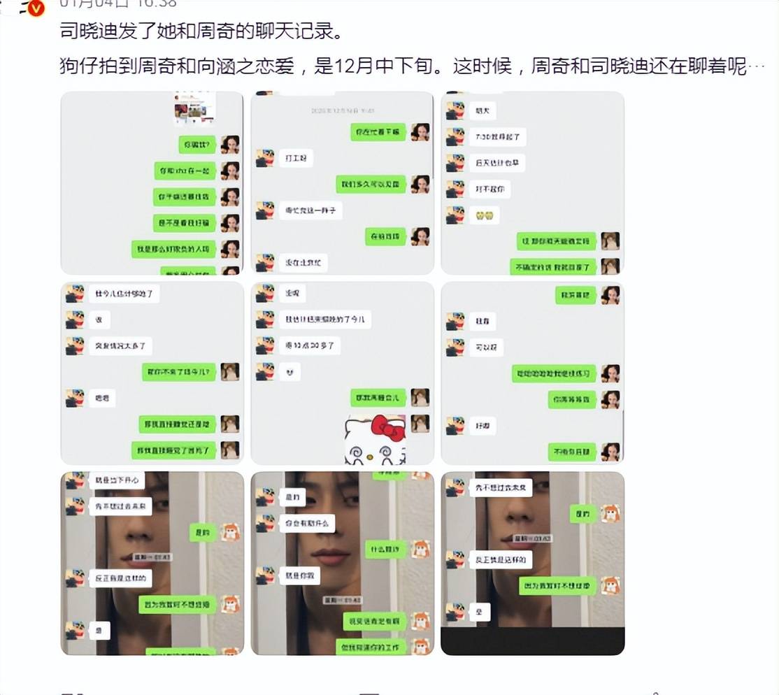 2026年1月3日,网红司晓迪(账号@iamroosie)曝光与周奇的聊天截图,显示12月19日双方讨论见面安排(如"你忙完和我说,我去找你咯"),并质问"你和向涵之在一起干嘛还要找我?看我好骗吗?"。