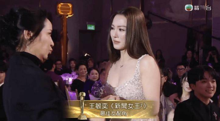 获奖瞬间,王敏奕满脸错愕,上台前,龚慈恩主动拥抱鼓励她,佘诗曼还特意上前为她整理头发,十分贴心。