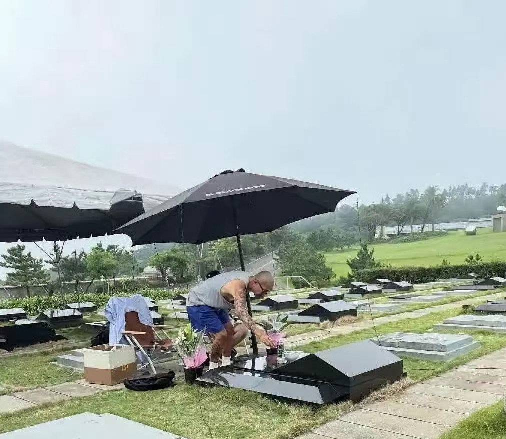他手里拿着大S生前最爱吃的几样点心,蹲在墓碑前,一遍又一遍地用手里的素色手帕擦拭着石碑。