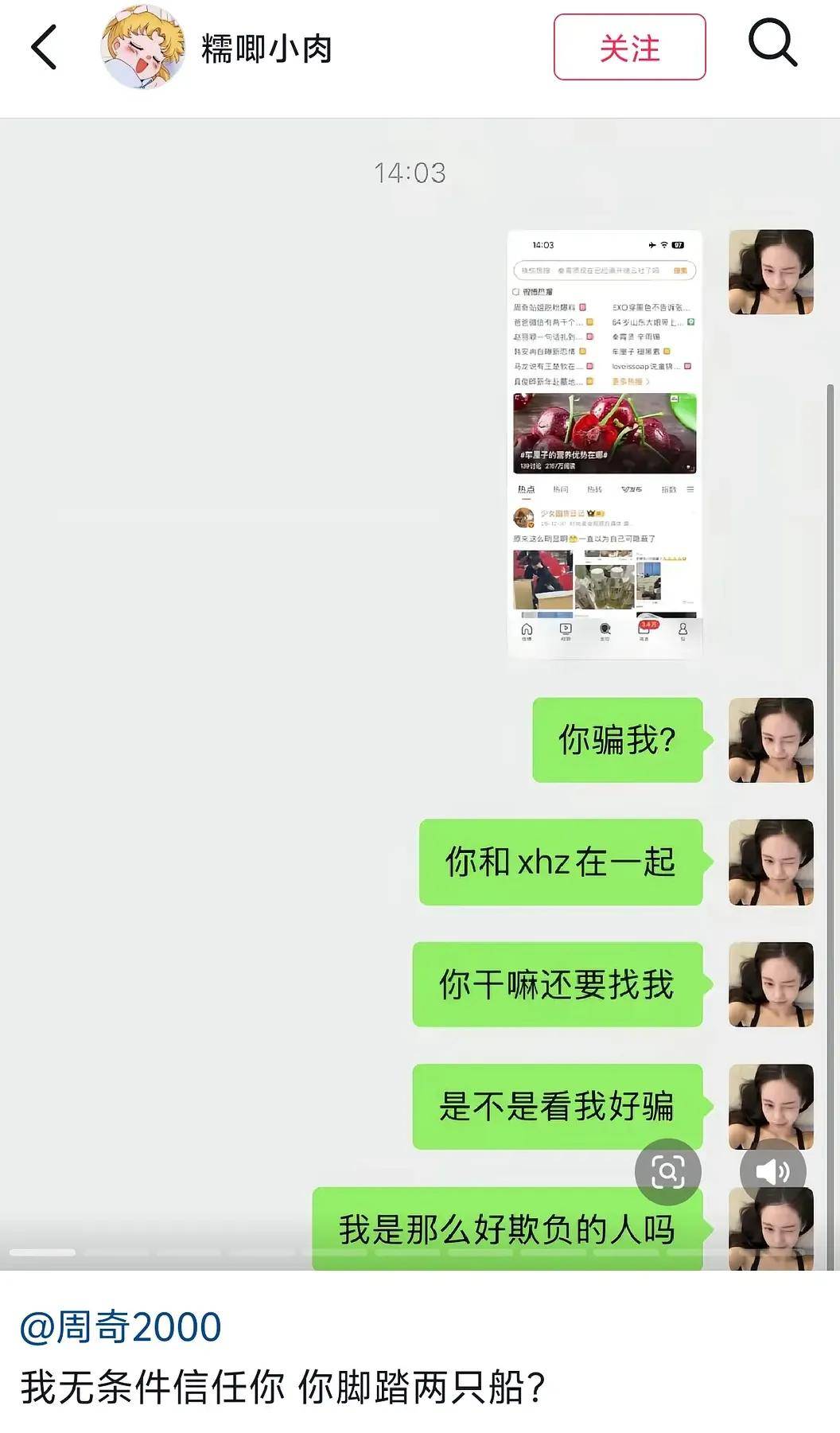 公开在社媒艾特周奇对线,怒斥他辜负了自己的信任,质问他为何脚踏两条船。同时,还晒出了部分聊天记录,喊话周奇“你和向涵之在一起,你干嘛还要找我。”痛批男方欺骗她。对方均无回应。