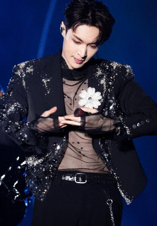 视觉造型同样成为话题风暴眼。一袭黑色真空西装搭配透视蕾丝内搭,若隐若现的肌肉线条被网友戏称为“内娱菩萨显灵”。而舞台上那段19秒的扭肩比心镜头,更因极致反差萌强势出圈,成为无数二创剪辑的焦点素材。