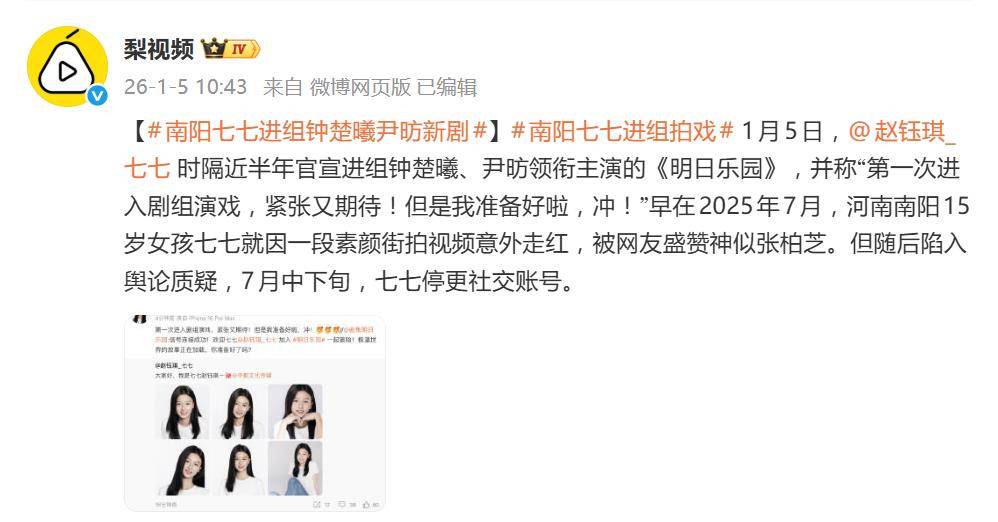 据1月5日报道,时隔近半年,那个被称为“神似张柏芝”的15岁南阳女孩七七(本名赵钰琪),突然杀了个回马枪。不过这次,她不是以网红身份回归社交平台,而是直接官宣进组——加入了由钟楚曦、尹昉主演的无限流新剧《明日乐园》。一句“第一次进入剧组演戏,紧张又期待!但是我准备好啦,冲!”,瞬间在网友间炸开了锅。
