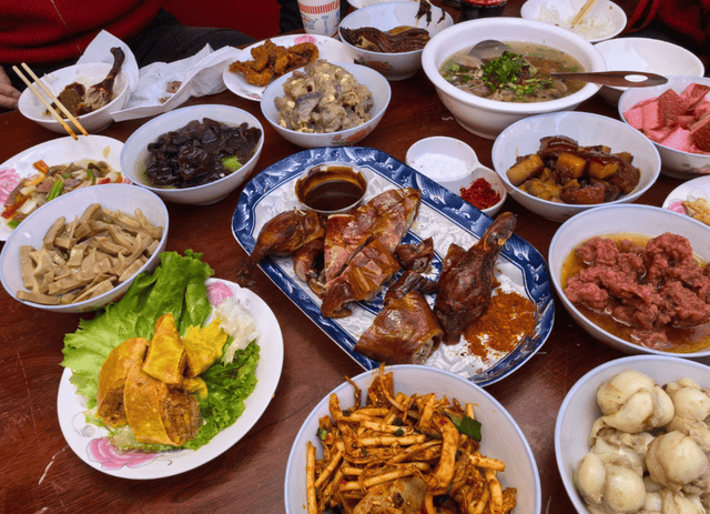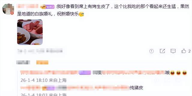 而从龚琳娜晒出的酒席来看,15道菜摆满红色桌子,其中,12道是荤菜,而且,每道看起来都好吃不腻,其中,有网友就被那一大碗烤生皮馋的流口水羡慕称:“这个比我吃的那个看起来还生猛,果然是地道的白族婚礼”。