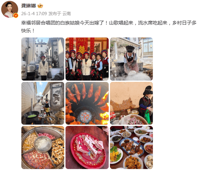 1月4日,歌手龚琳娜在个人社交平台分享出参加邻居白族姑娘婚礼动态,她开心写到:“山歌唱起来,流水席吃起来,乡村日子多快乐。”