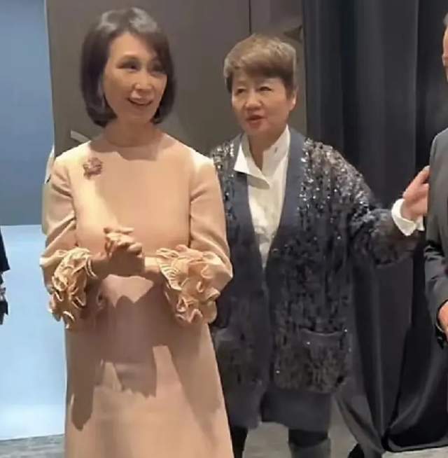 画面中,梁安琪站在何超凤身侧,向她介绍着身边的人。在颁奖典礼这样的社交名利场中,梁安琪的状态明显更活跃,而她身旁的何超凤则内敛许多,大多时候都是在点头微笑。由于画质和滤镜的关系,两个人看上去面部状态差距还不明显。