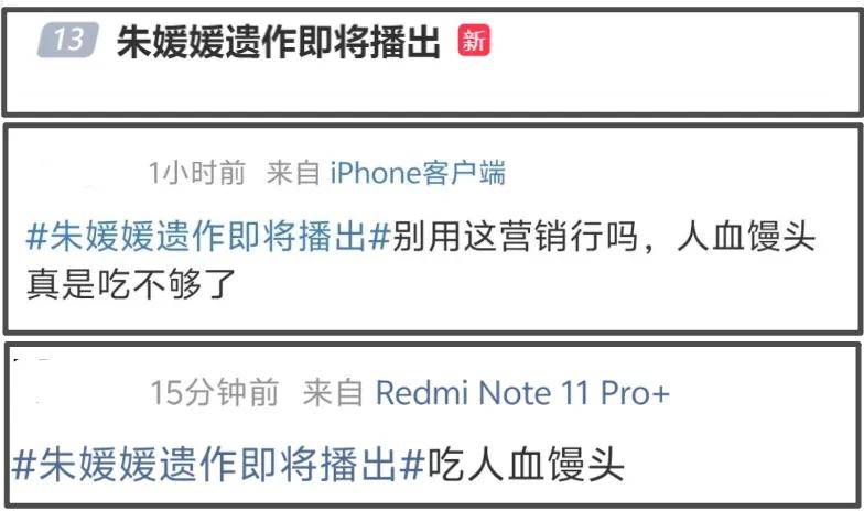 在网友看来,带着“朱媛媛遗作”五个字上热搜宣传剧集播出,有消费逝者的嫌疑,不止一位网友把矛头对准剧方,怒斥他们吃人血馒头。