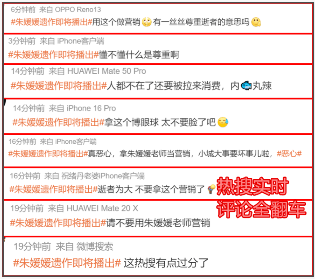 目前“朱媛媛遗作即将播出”相关话题已经出现在了热搜榜单之上,多个大V带着相同的热搜话题和几乎一致的文案发博宣传,颇有种大规模营销的感觉,给人的观感极为糟糕,整个宣传已然翻车了。