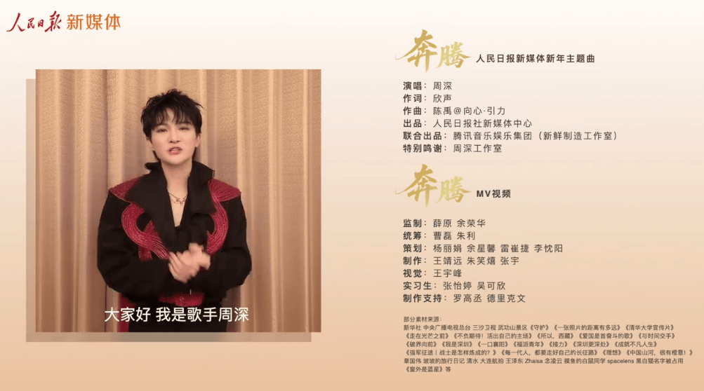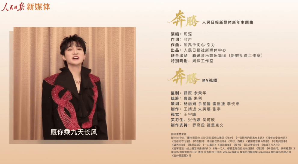 歌曲《奔腾》是“人民日报新媒体新年主题曲”,作为当红男歌手,周深此次能够受邀演唱“人民日报新媒体新年主题曲”也代表着他优质艺人的一面。
