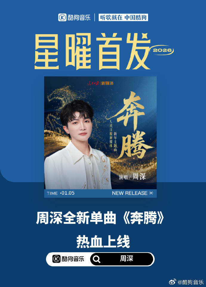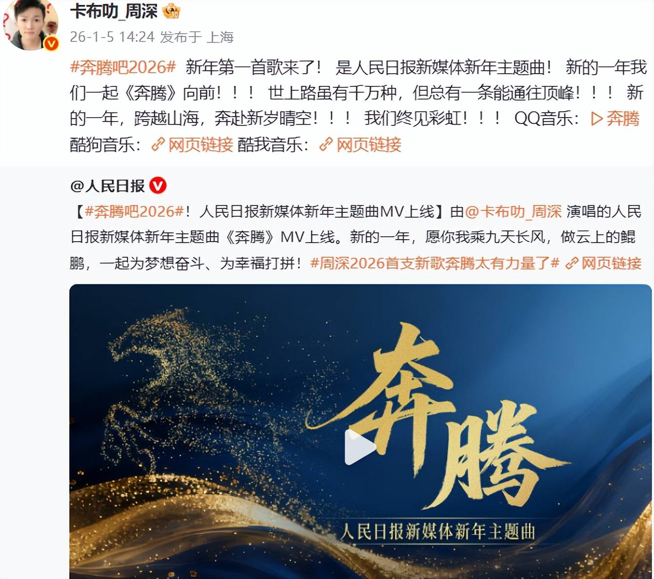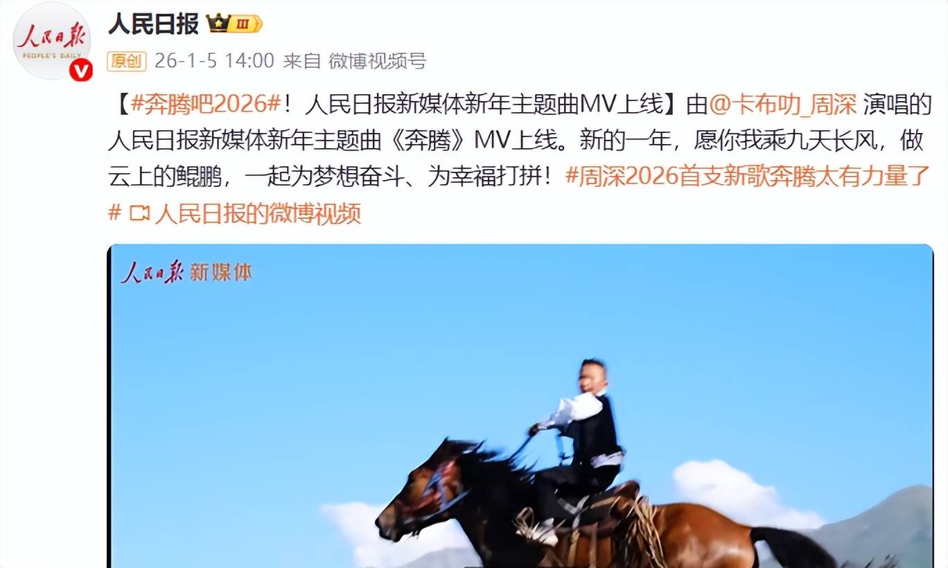 周深献唱2026“人民日报新媒体新年主题曲”!2026年1月5号下午14:00,人民日报发布消息:【#奔腾吧2026#!人民日报新媒体新年主题曲MV上线】由@卡布叻_周深 演唱的人民