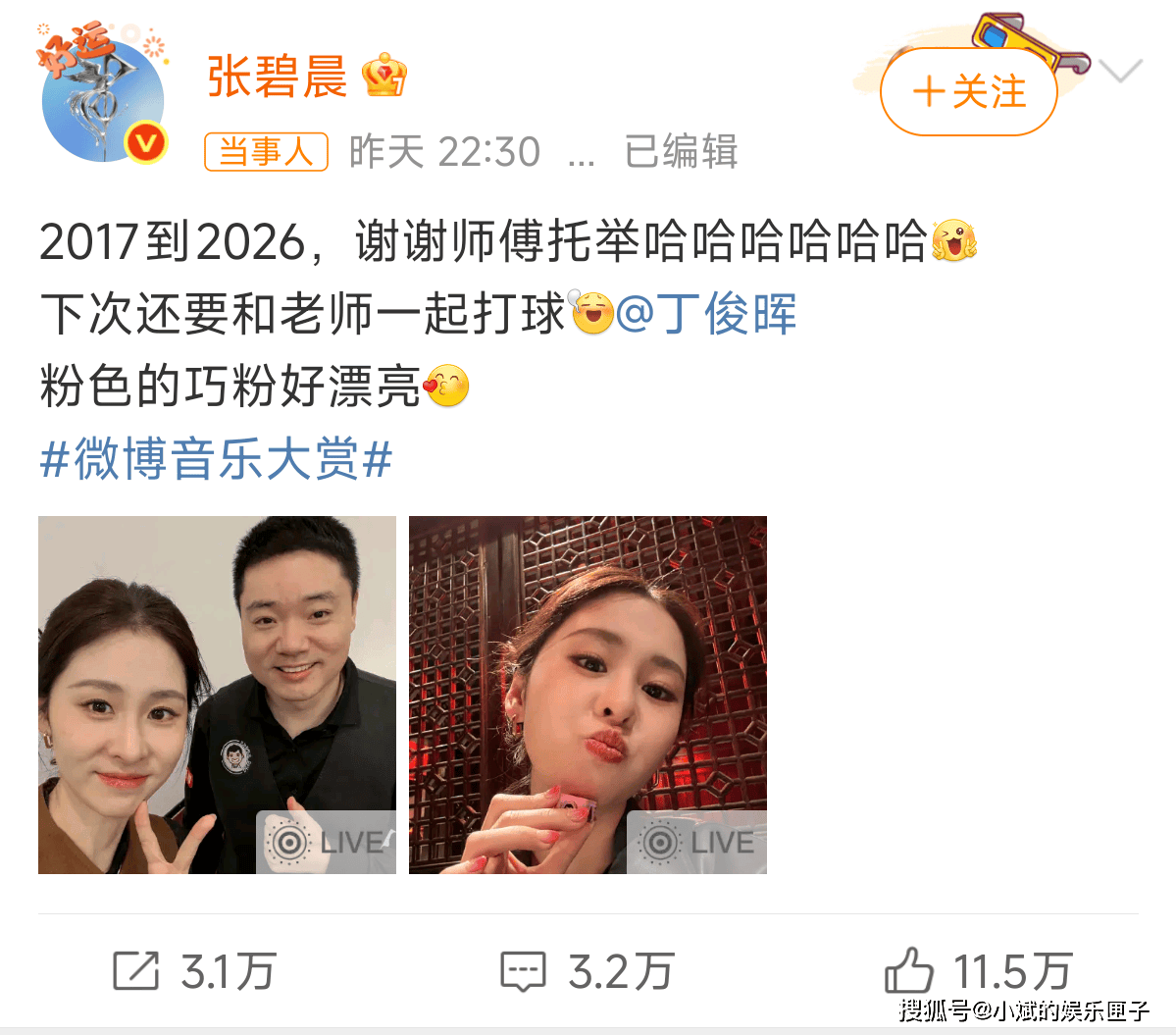 赛后,张碧晨在社交媒体分享喜悦,感谢师傅丁俊晖的悉心指导,并表示"下次还要和老师一起打球"。这份谦逊与好学赢得网友一致好评。她的斯诺克首秀不仅展现多才多艺的一面,更用实力证明跨界能力。从2017到2026,她与丁俊晖的师徒情谊也引发关注。