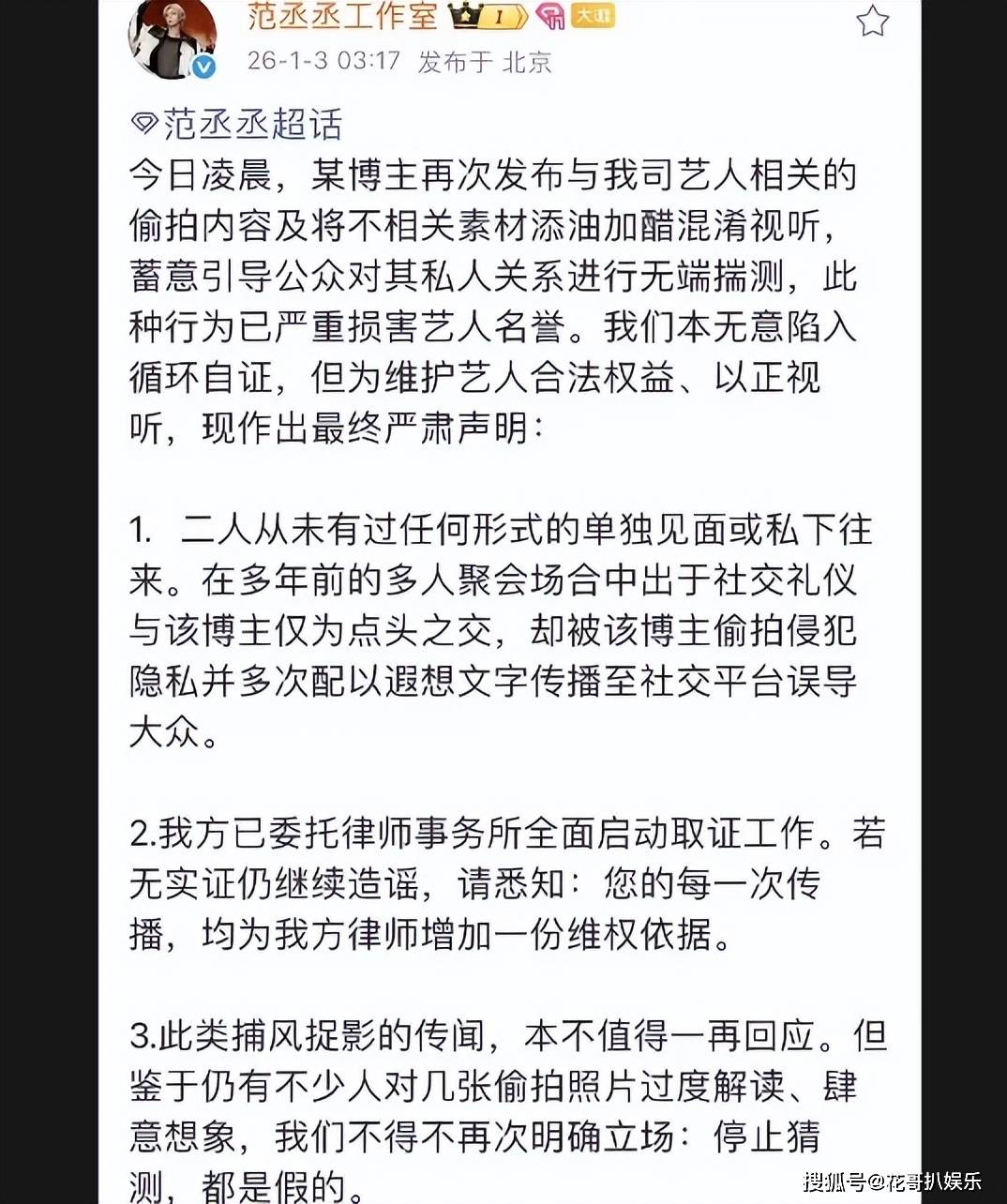 司晓迪刚刚平静了一两天,就有人觉得自己已经平安度过此劫了。当初被卷入这场风波的范丞丞先是工作室火速发布声明,表示两人只是若干年前偶然见过一面,咬死不承认有任何私下关