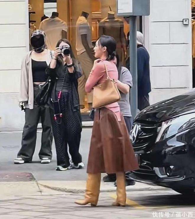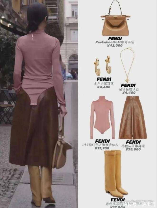 腿部的半身裙是棕色皮质面料,摸起来光滑平滑。要穿出这种材质的裙子高级感,必须有很好的垂坠感,这样穿起来会显得干练且利落。喜欢注重品质的女性在挑选这种裙子时,一般都会选择柔软度好、不容易起球的材质。