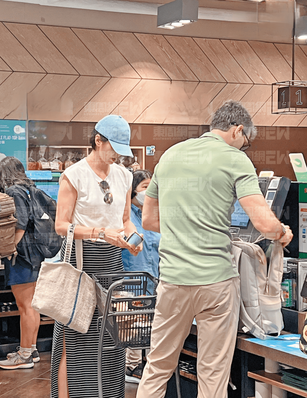 两人买了满满一堆食材后,在自助收银机前亲自一件件扫码。令人意外的是,面对这么多货品,他们并没有购买一元的塑料购物袋,而是硬是把所有食材塞进背包里,既节俭又环保。离开时,梁咏琪自然地挽着丈夫的手臂,一边聊天一边走向停车场,甜蜜又真实。