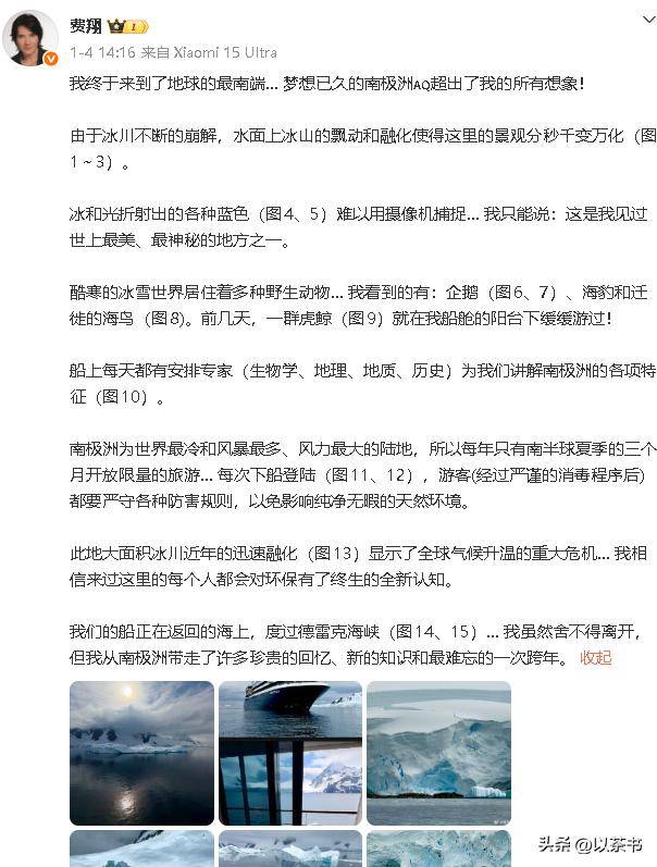 更有意思的是,这条动态并不在跨年当天发。1月4日,假期结束、打工人已经回到工位,65岁的费翔才慢慢把照片放出来:雪、冰山、企鹅、蓝得发亮的海。