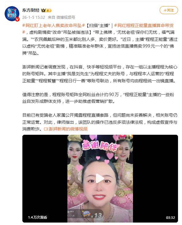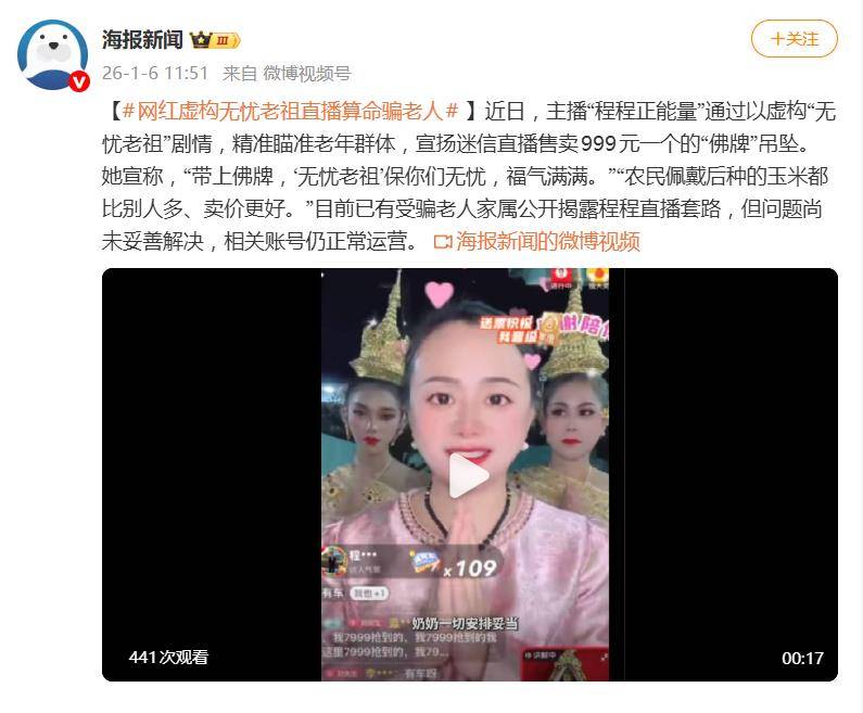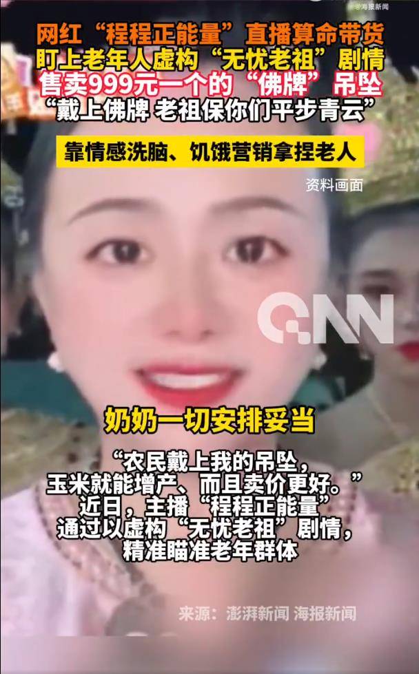 据1月6日报道,网红主播“程程正能量”和她那套“无忧老祖”的戏码,在网络上被扒了个底朝天。这回被精准收割的,不是跟风的年轻人,而是信息屏障后的老年群体——靠着编造的玄幻剧情和情感操控,一个成本不明的吊坠被卖到999元,还宣称“农民戴上种玉米都能增产”。更魔幻的是,骗局已被家属公开揭露,相关账号却依然在平台正常运转,仿佛无事发生。
