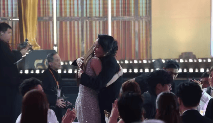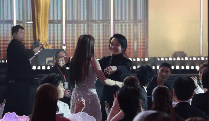 同剧女主佘诗曼更是上前拥抱王敏奕,为她整理衣服和头发,让她漂亮上台感受她的高光时刻,彷如邻居大姐姐一样。台下的演员同事更是齐声欢呼,王敏奕犹如“团宠”的礼待让她不禁泪洒台上。