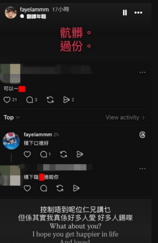 另外,林霏儿还曾公开在其社交网上,怒斥对她性骚扰的网民。据林霏儿透露,她收到他人的低俗文字,对方的语言十分露骨。